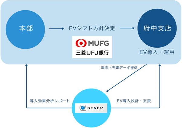 三菱UFJ銀行では、導入したEVの充電に関して、REXEVのサービスを活用することで電力需給逼迫に応じた電力節電要請に応える仕組み(EVへの充電を止める運用)を作り、VPP事業へ協力することとした。