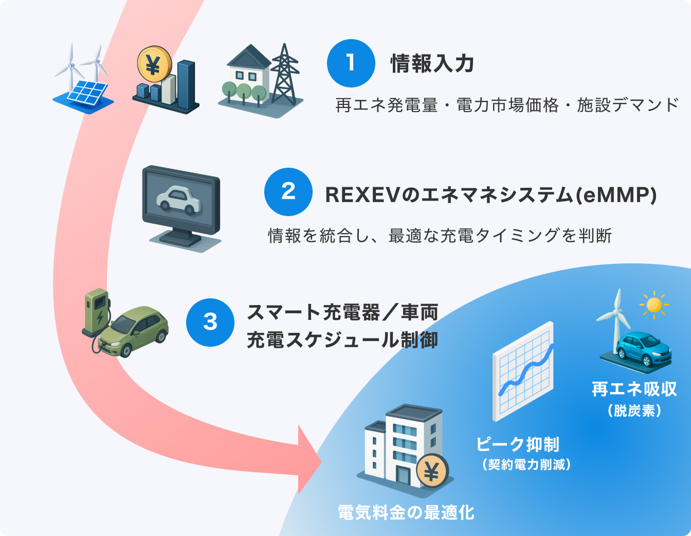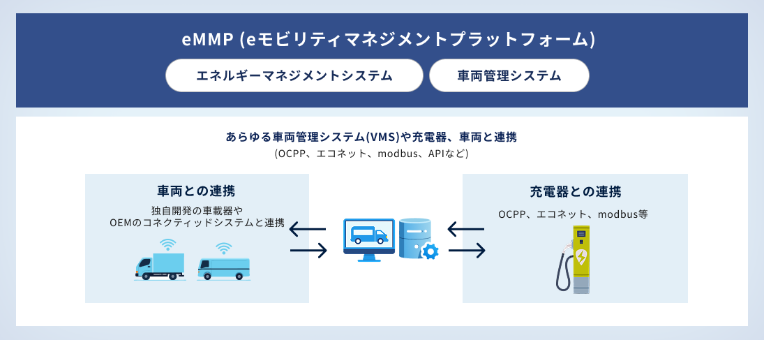 eMMPは充電制御、車両管理、API連携を組み合わせ、EV運用の効率化、コスト削減、データ活用を実現する国内初のプラットフォームです。