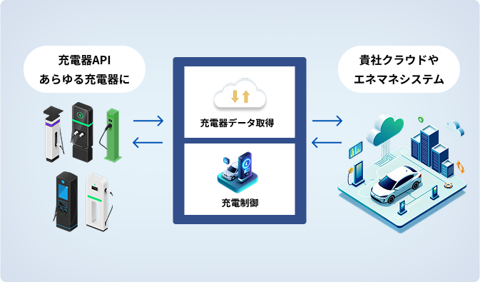 あらゆる充電器と接続するための充電器APIを提供します。このAPIを使うことで、異なるブランドやモデルの充電器とシームレスに連携し、充電器の制御を実現します。既存のインフラをそのまま活用し、より効率的な運用を行うことができます。