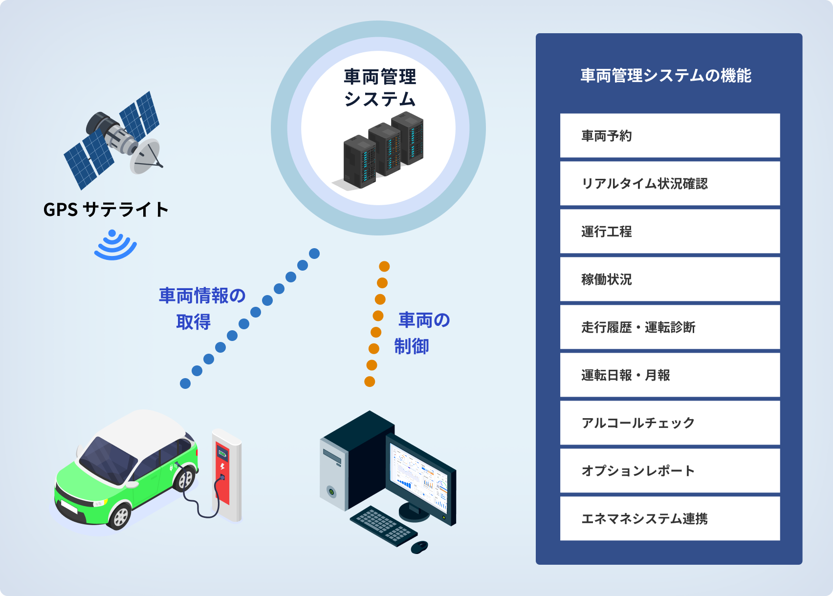 車両情報の取得や車両の制御などの機能を有し、効率的かつ経済的な充電、迅速な車両配備等に寄与します。